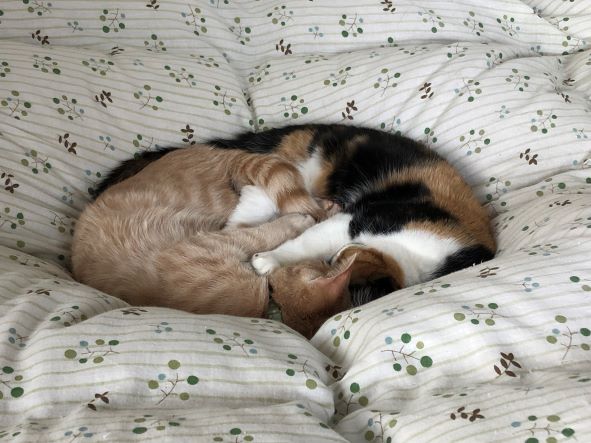 しばらくして抱っこに飽きたまめがウロウロし始めると、そろりそろりとりんがやってきて、わたしの傍にピッタリ引っ付いてねんねし始めました。